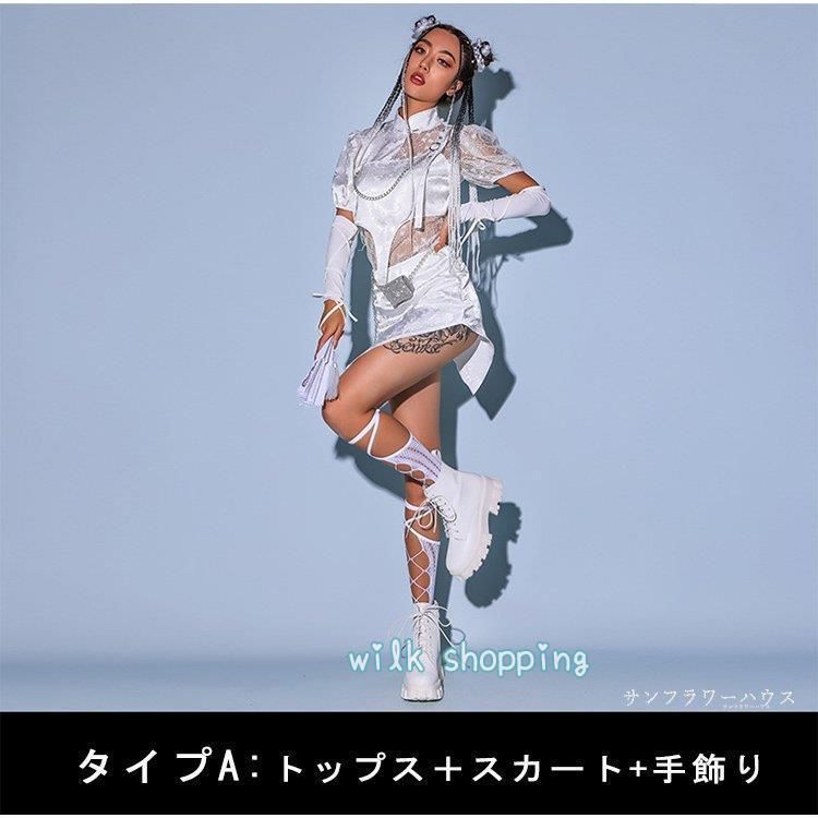 韓国 ダンス 衣装 セットアップ レディース へそ出し メッシュ 刺繍 レーストップス パンツ スカート ジャズダンス ヒップホップ 白 パンツ