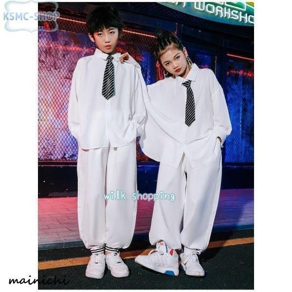 キッズダンス衣装 セットアップ ヒップホップ 無地シャツ 大きめ 黒 白 ユニセックス B系 ストリート お洒落 HIPHOP シャツ パンツ ネクタ