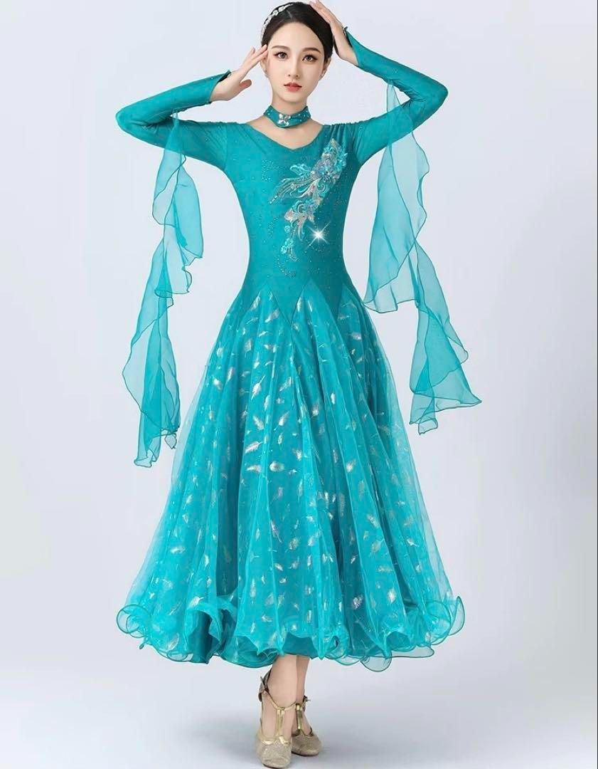 社交ダンス 衣装 スタンダード ドレス ワンピース 緑 スタンダードドレス デモ フロート フリル レース競技 パーティ グリーン系 おしゃれ ふんわり スカート サイズM 競技用 ダンスドレス 発表会 クラシック 女性用 フェミニン スタイリッシュ 上品